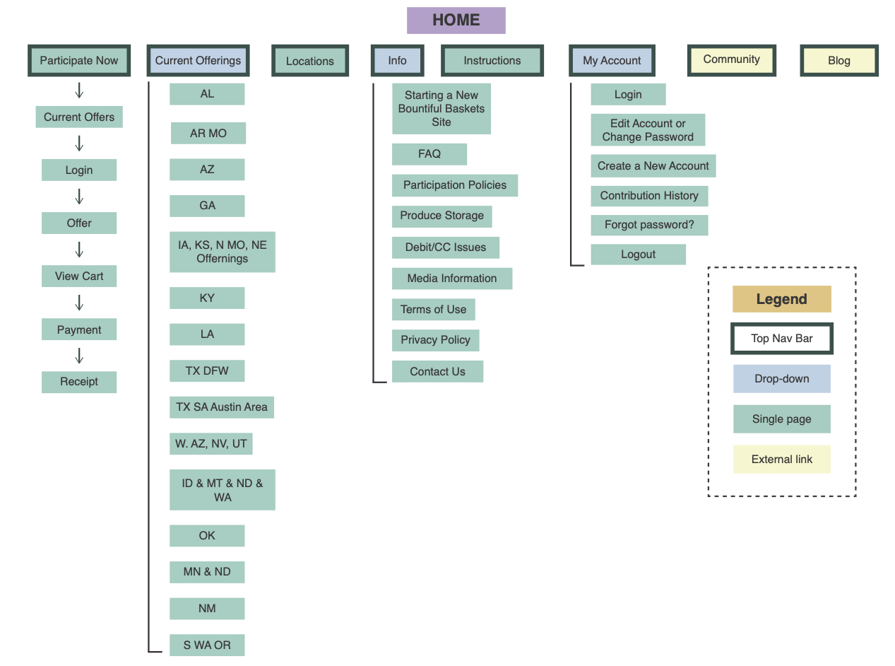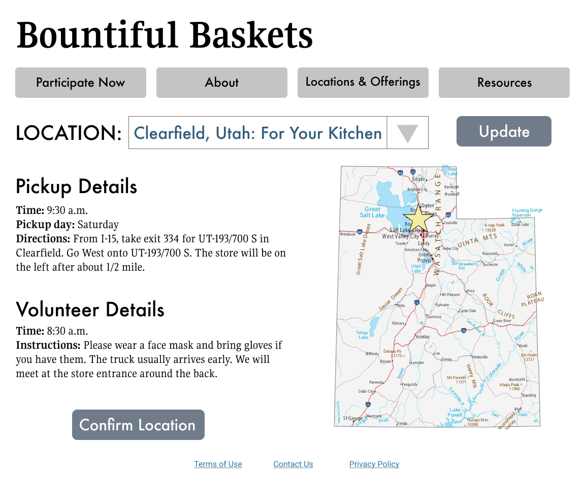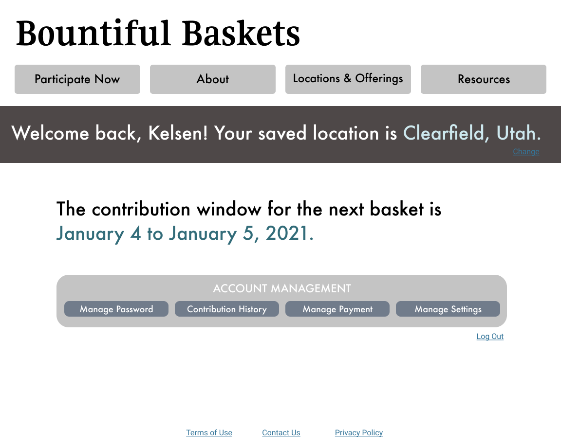 - Features and functions: The most important function of the site is to facilitate user contributions. This in turn necessitates a clear and secure payment page. Another priority is a feature that shows users Bountiful Basket locations and the offerings at those locations.