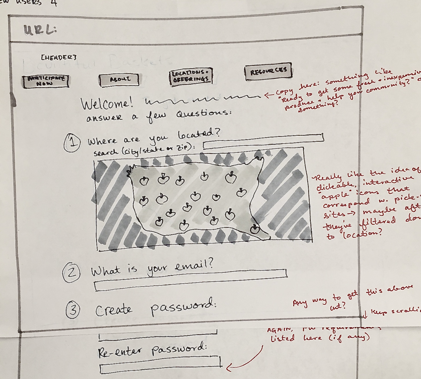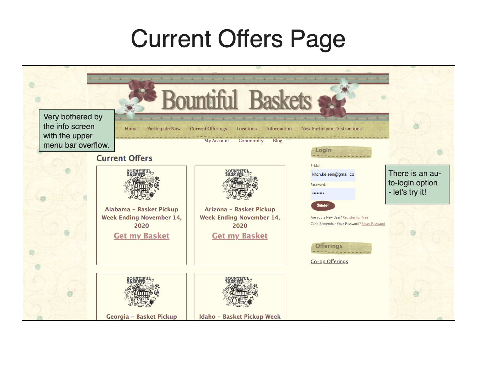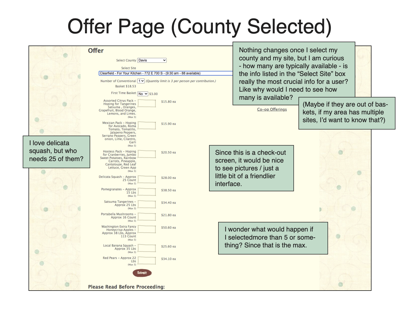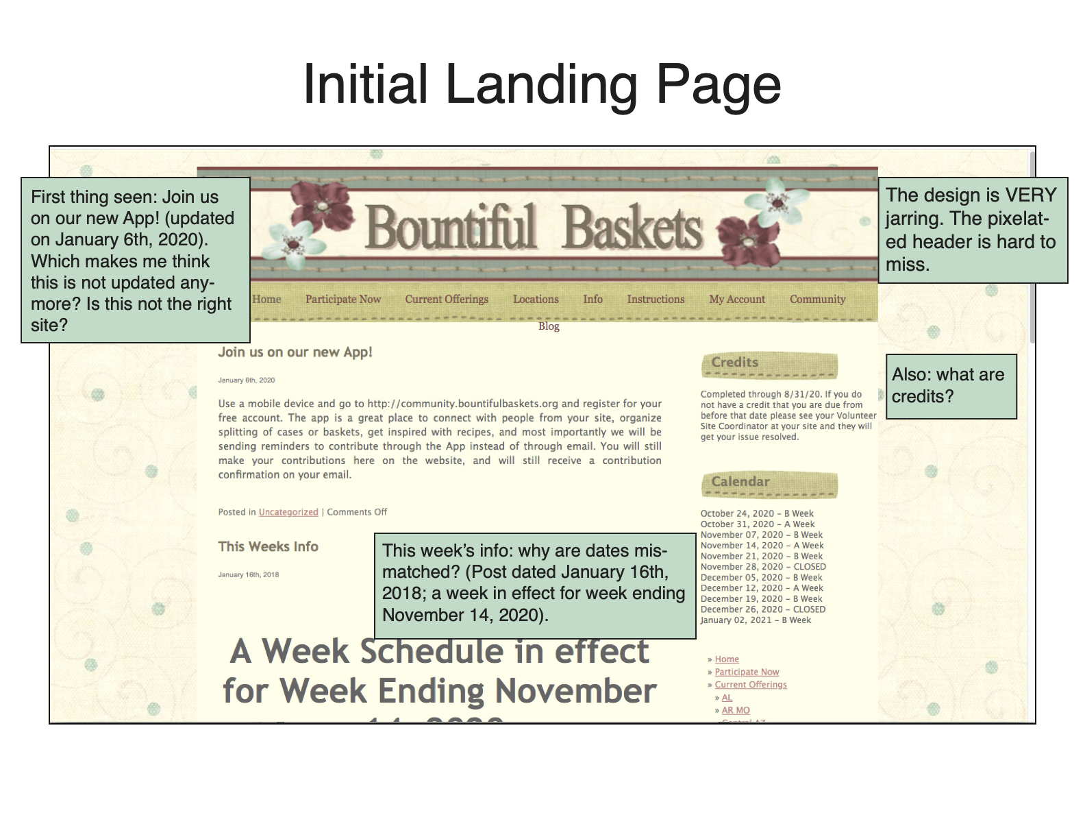 My initial research was two-pronged: I first sought the feedback of first-time users, and then recorded my own ideas and impressions as a Bountiful Baskets veteran. Performing the user research first helped me gain a new perspective on the site before I conducted my heuristic markup.