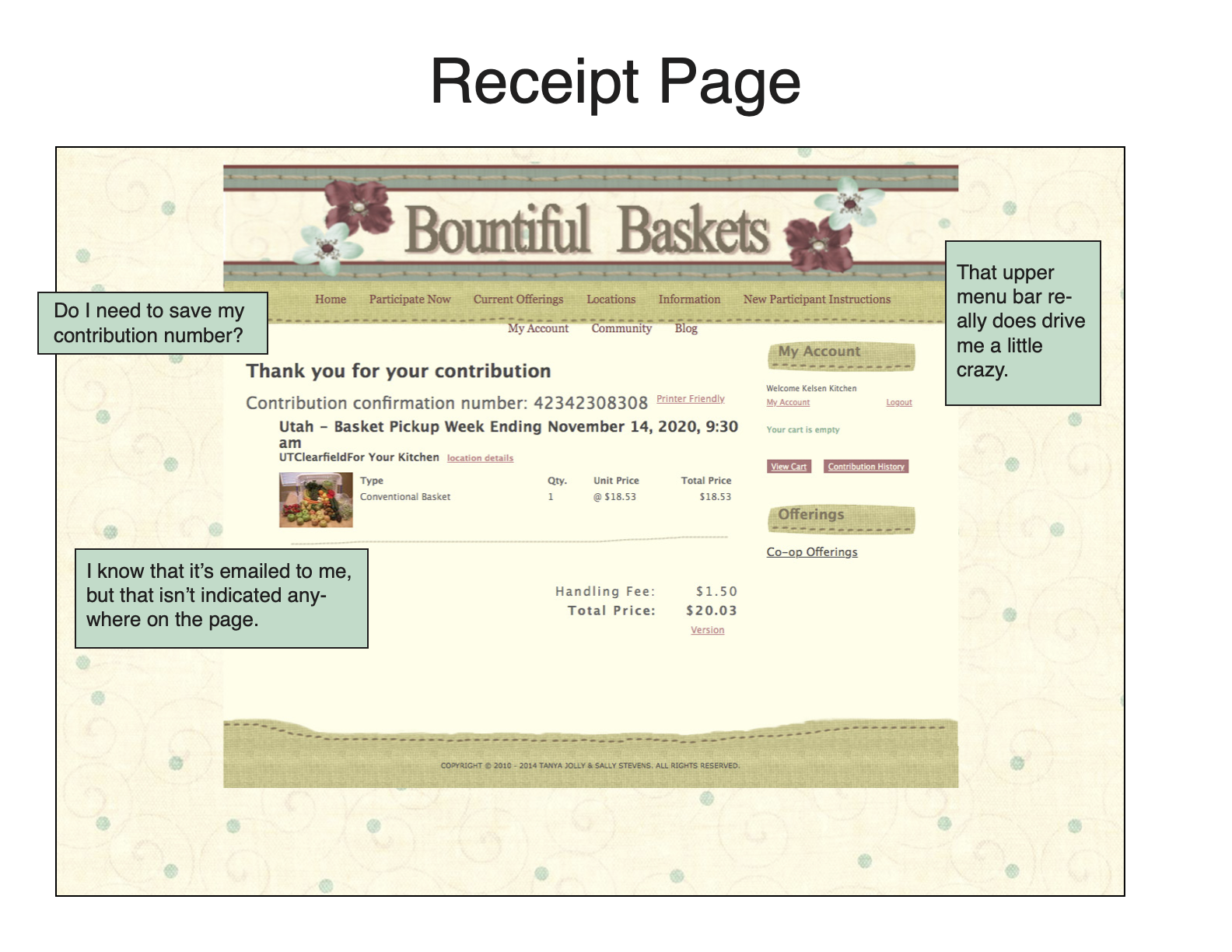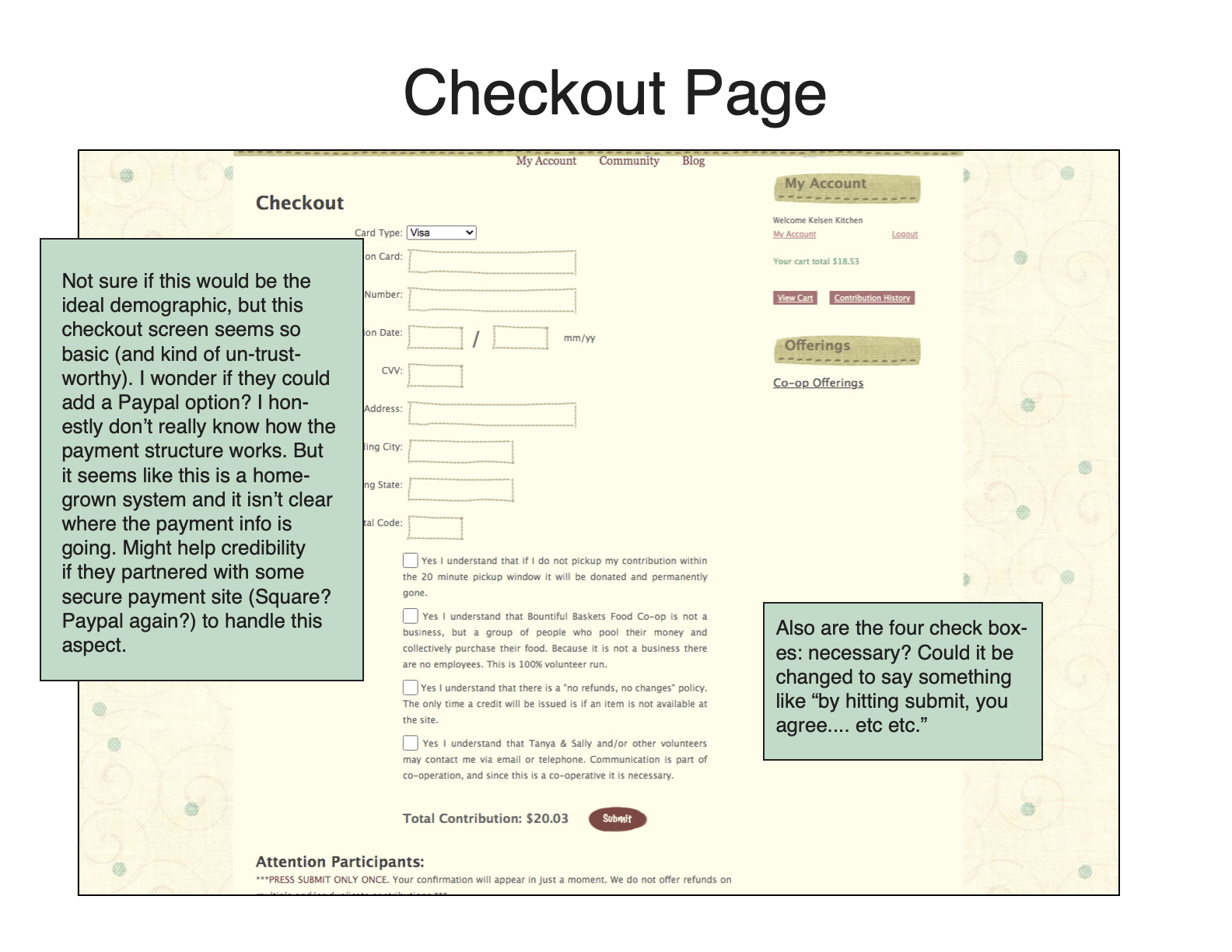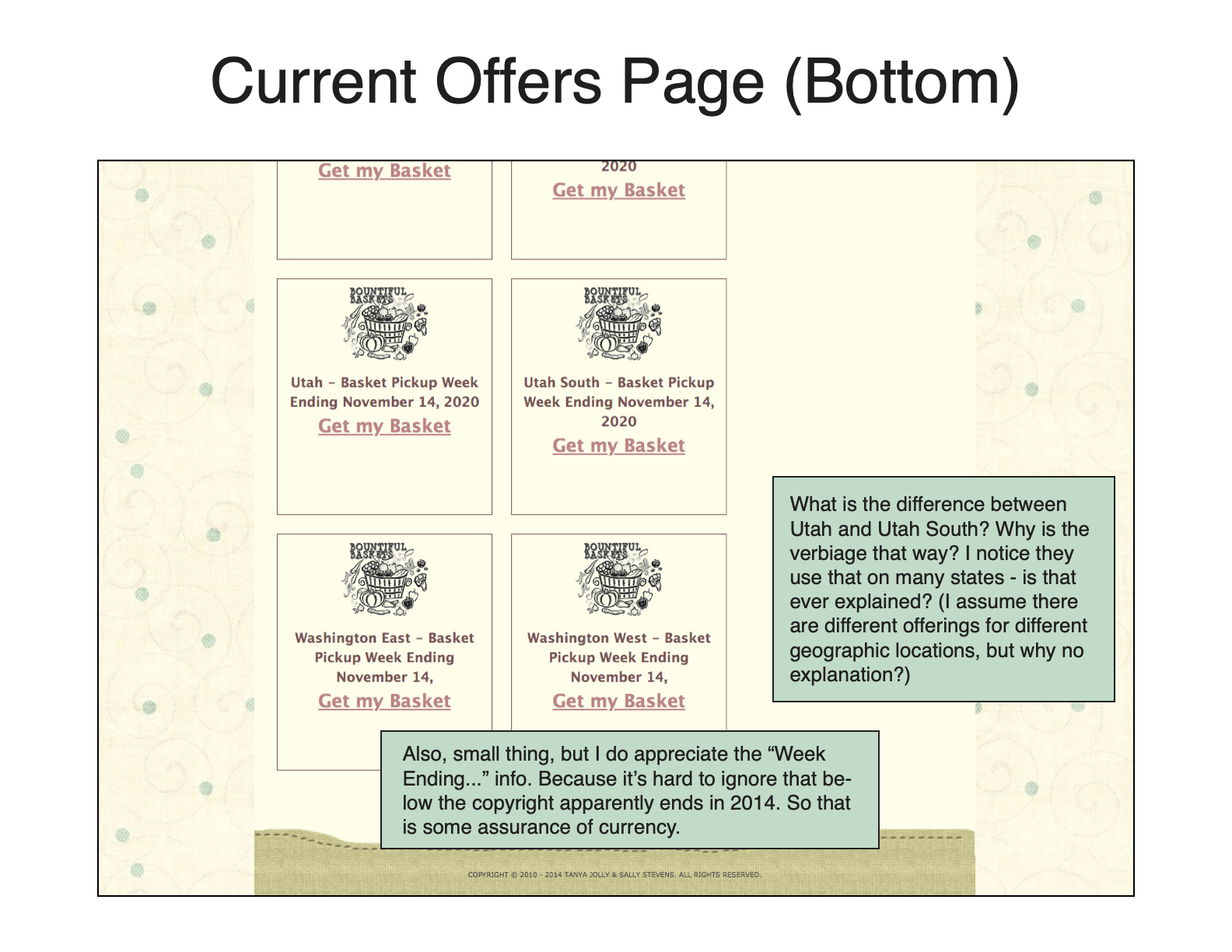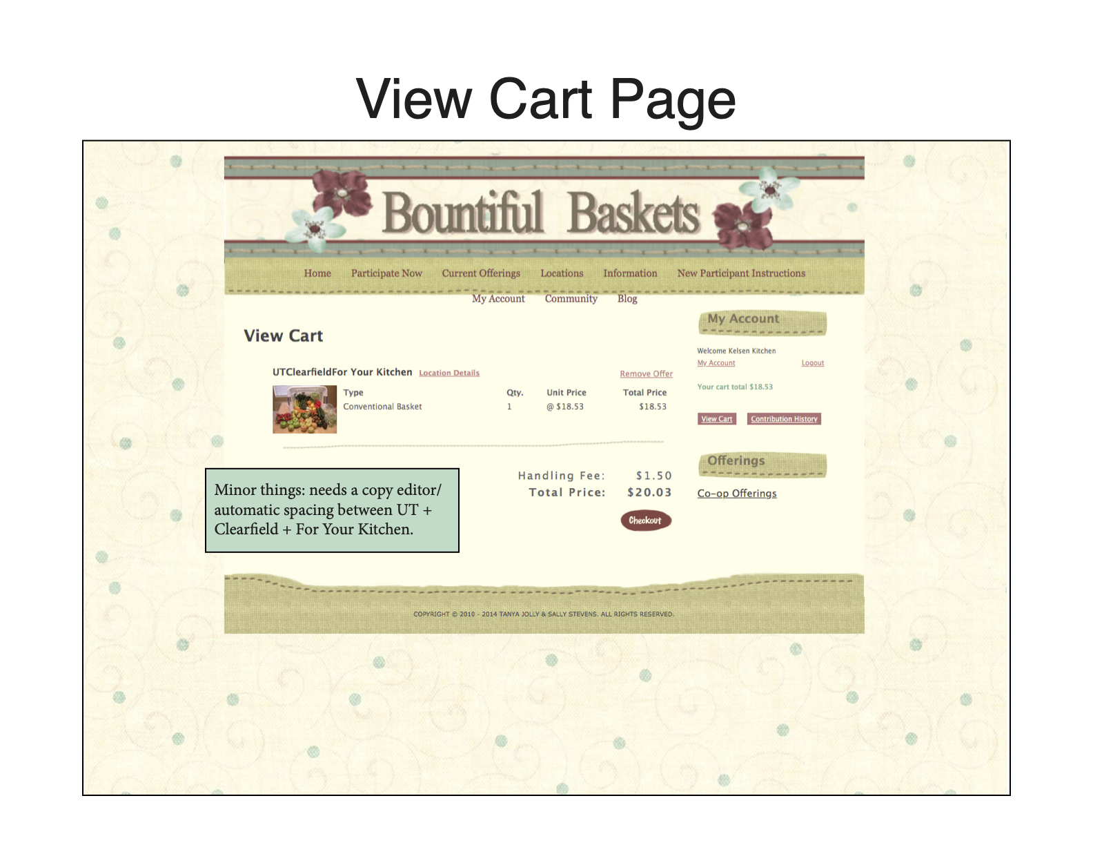 - The check-out page was very basic and, in a way, seemed untrustworthy. Additionally, the bottom footer for each page said “Copyright 2014.” Could Bountiful Baskets partner with Paypal/another 3rd-party vendor to create a more professional-looking checkout page?