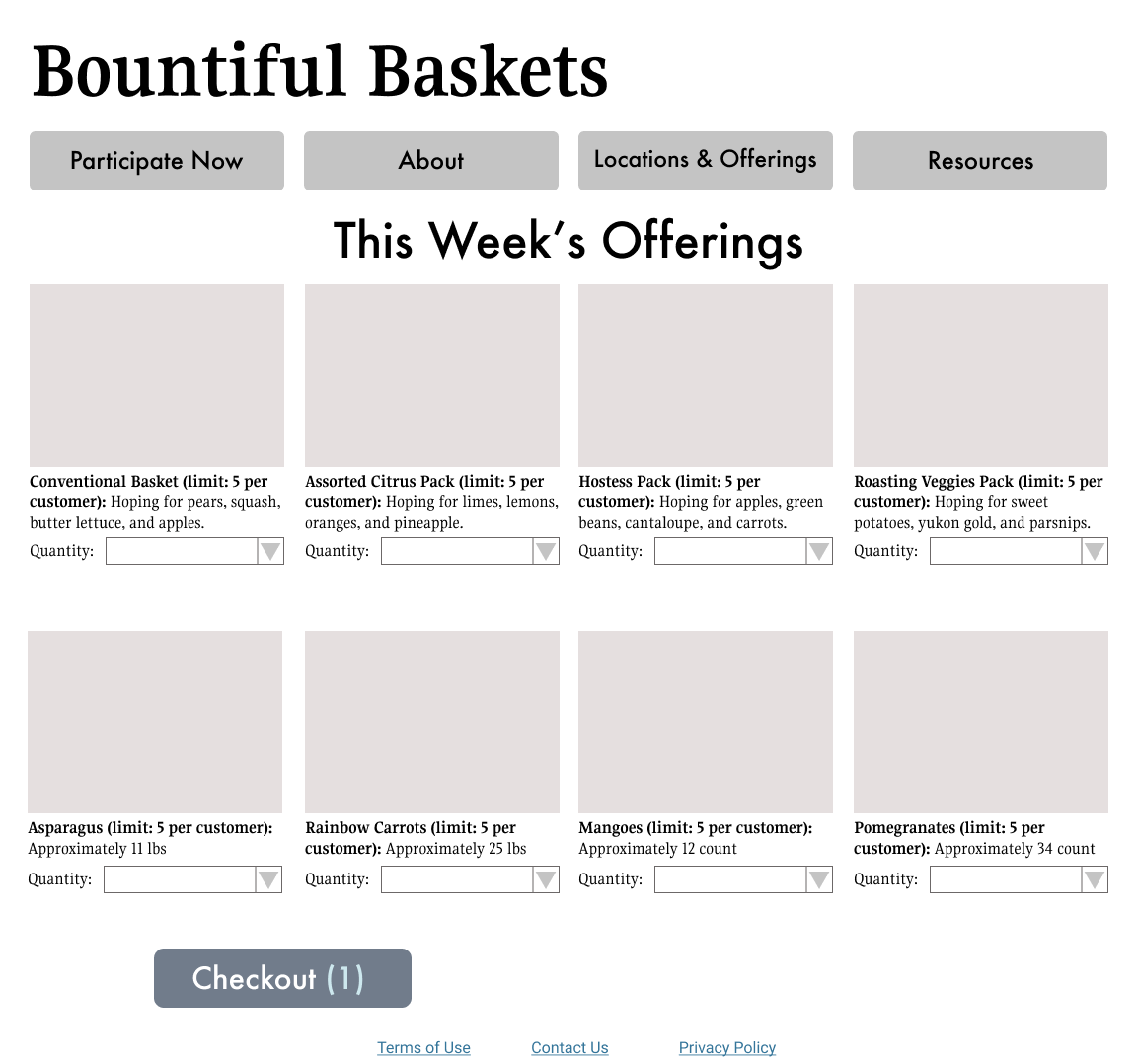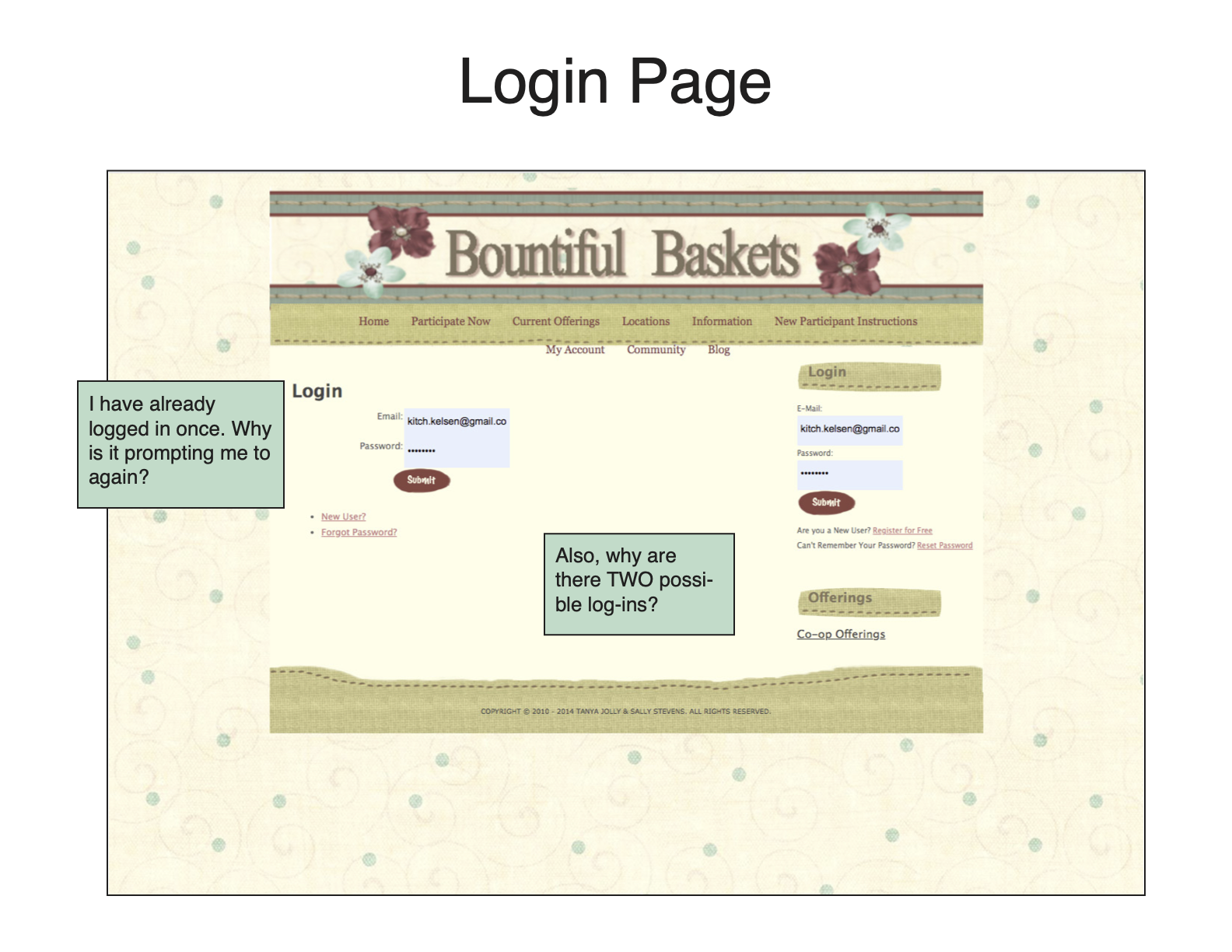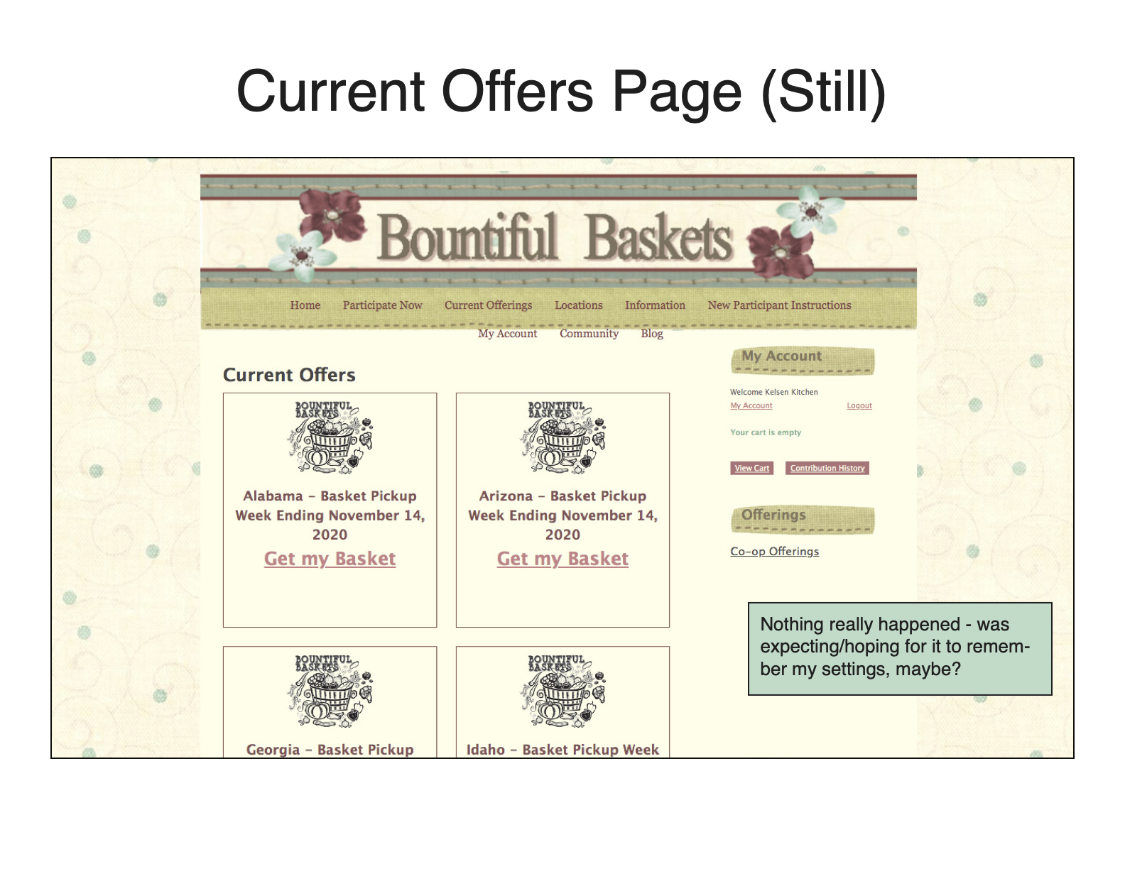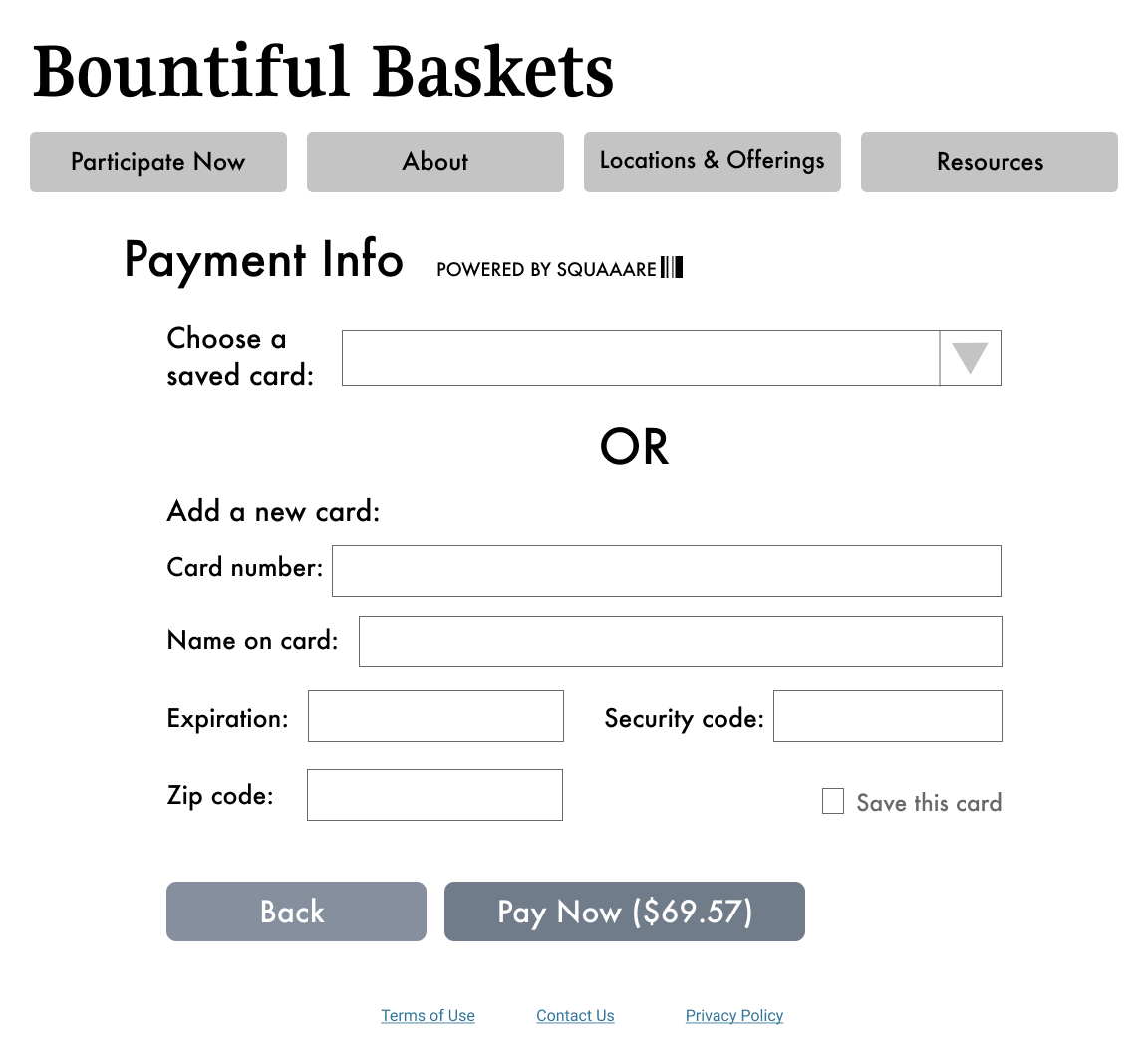 - The check-out page was very basic and, in a way, seemed untrustworthy. Additionally, the bottom footer for each page said “Copyright 2014.” Could Bountiful Baskets partner with Paypal/another 3rd-party vendor to create a more professional-looking checkout page?