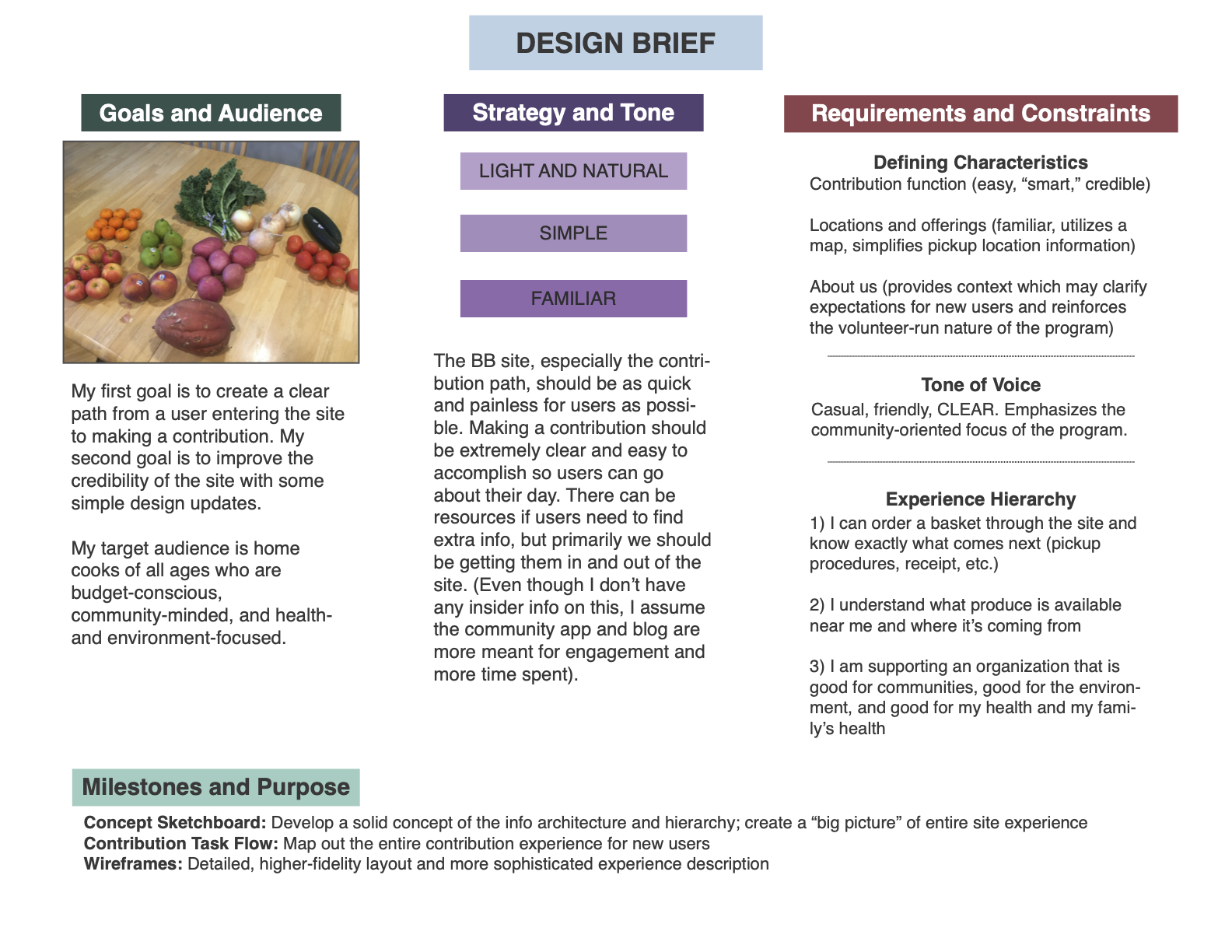 Following Buley’s method, I wanted to establish five items before creating the brief: