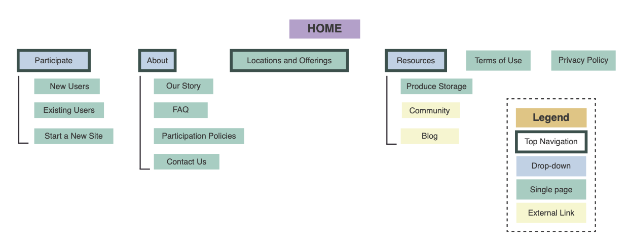 If I were to sum up my recommendations to make Bountiful Baskets site more usable in one word, that word would be "simplify." Through the user research, I learned that certain content expectations weren’t being met by the current site (where to find contact information, how to order a basket); not necessarily because these elements weren’t visible but because the elements were being drowned out by the visual noise of the site. In my proposed site map, I tried to consolidate pages that were similar, eliminate redundancies, and tuck pages that seemed less-trafficked into a tab together.